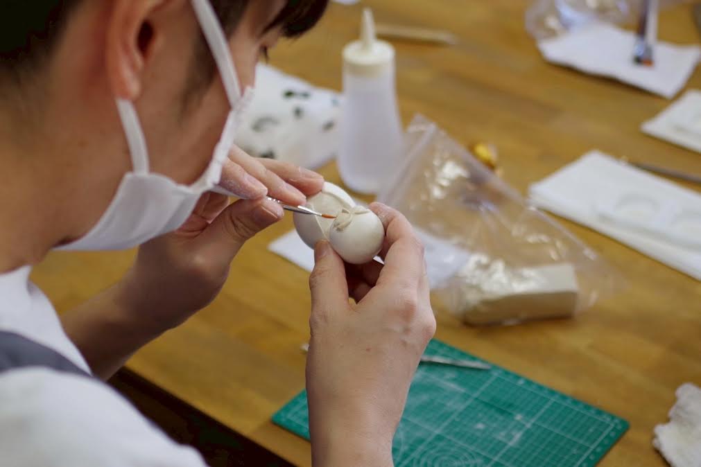 手や道具をつかって形をつくり、乾かしたあと絵の具で着色します。